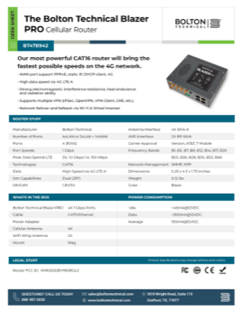 The Bolton Blazer Pro cellular router is compatible with AT&T, Verizon, and T-Mobile SIM cards.