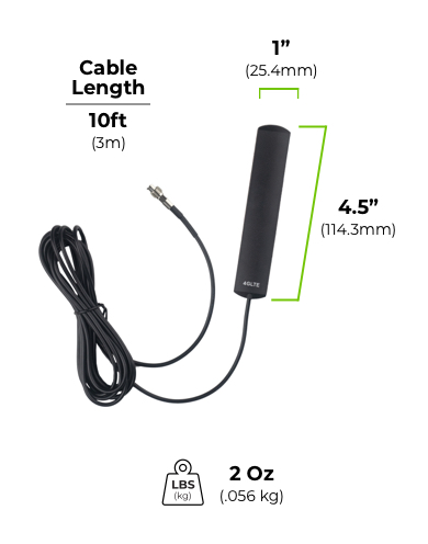 The B-Flat antenna handles all signal in the 698-2700 MHz bandwidths. It comes with an attached 10 feet of RG-174 coaxial cable with an FME-Female connector at the end. With adhesive on the back, it can easily be stuck to the side or back of a seat, or attached to an air conditioning vent.