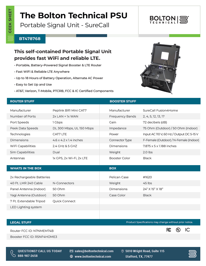 PSU is available in different versions to fit any situation. This model comes with a Bolton Victory Signal Booster and a Peplink BR1 Mini CAT7 Cellular Router.