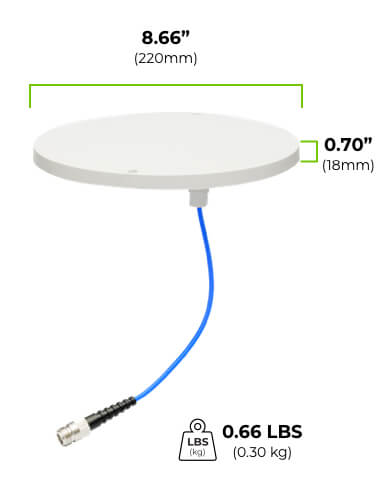 This is an ultra-high quality, Low-PIM dome antenna for broadcasting cellular signal and is the ideal accessory for your 50 ohm cell phone signal booster system, providing boost gain at the end point by up to 5.1 dB.